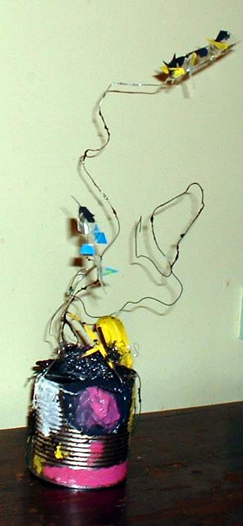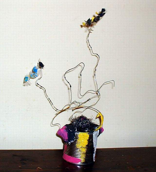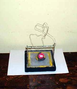 Due 1, 2003. Fil di ferro, plastica,sasso. Matrice,2003. Latta, fil di ferro, plastica.